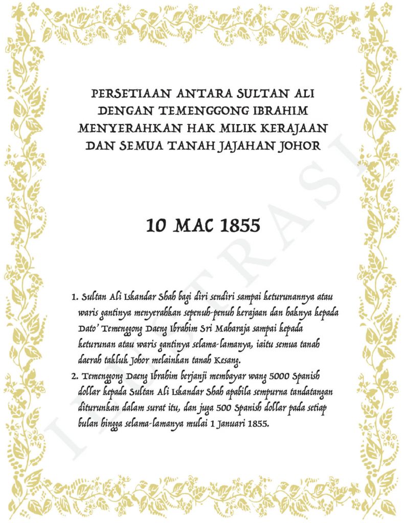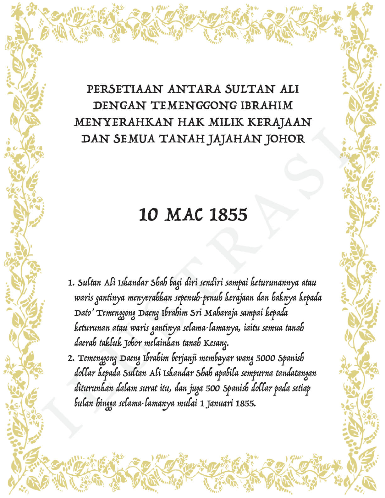 Persetiaan antara Sultan Ali dengan Temenggong Ibrahim menyerahkan hak milik kerajaan dan semua tanah jajahan Johor pada 10 Mac 1855