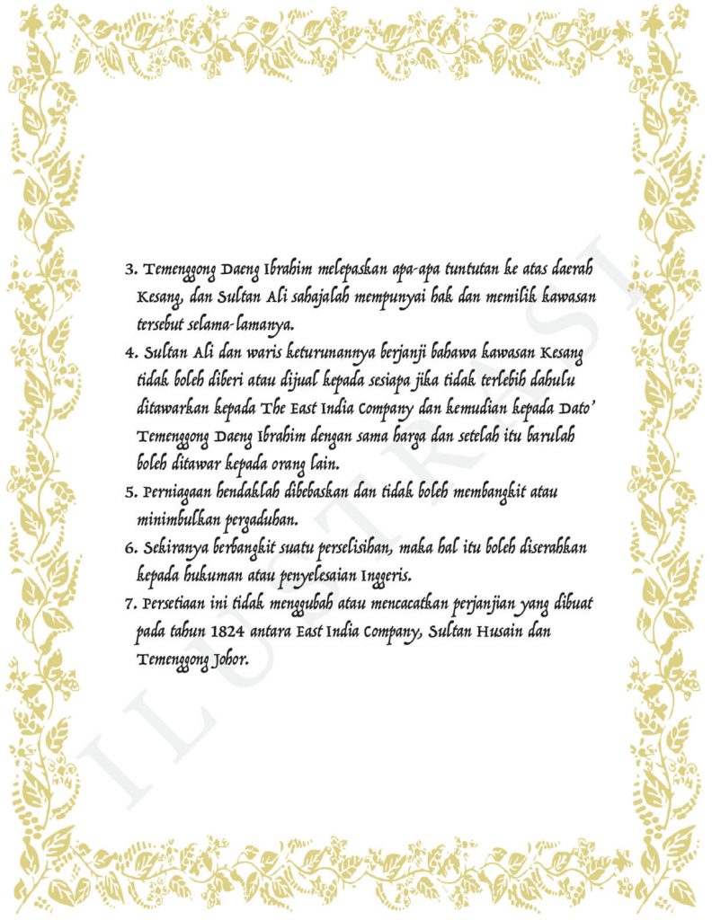 • Sultan Ali Iskandar Shah bagi diri sendiri sampai keturunannya atau waris gantinya menyerahkan sepenuh-penuh kerajaan dan haknya kepada Dato’ Temenggong Daeng Ibrahim Sri Maharaja sampai kepada keturunan atau waris gantinya selama-lamanya, iaitu semua tanah daerah takluk Johor melainkan tanah Kesang.