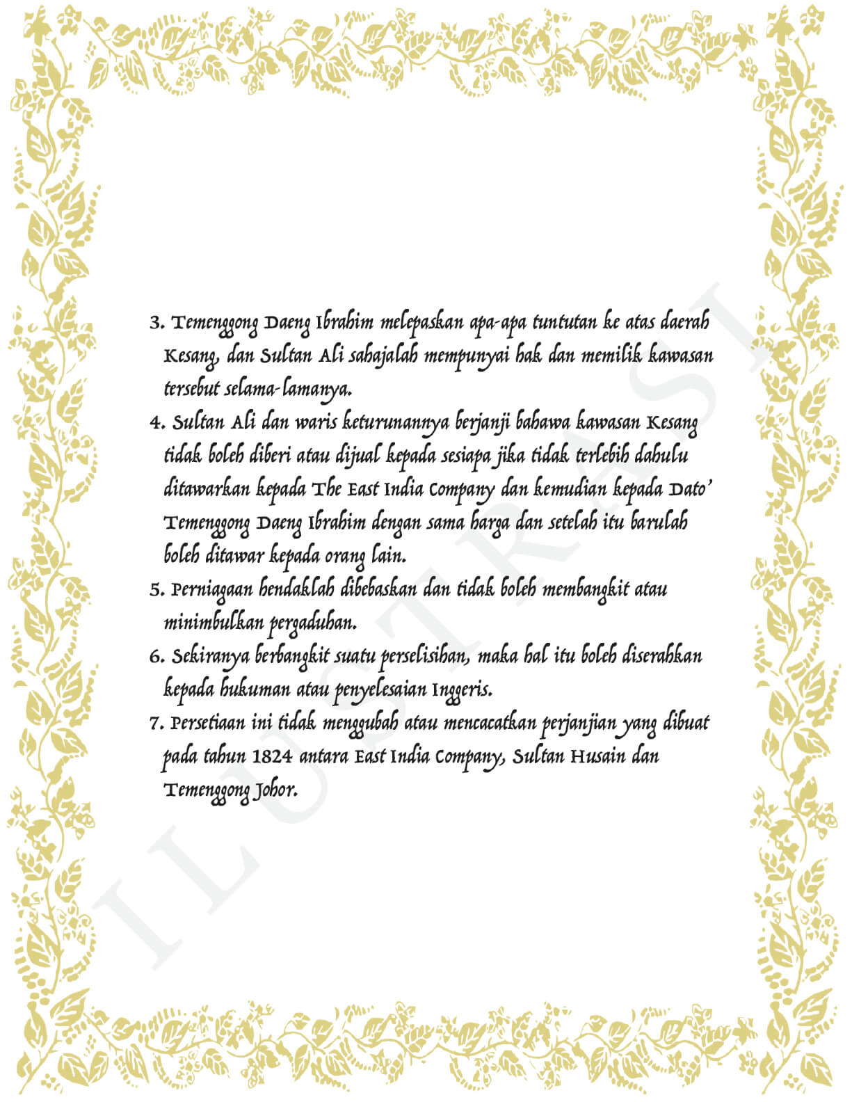 • Persetiaan ini tidak mengubah atau mencacatkan perjanjian yang dibuat pada tahun 1824 antara The East India Company, Sultan Husain dan Temenggong Johor.