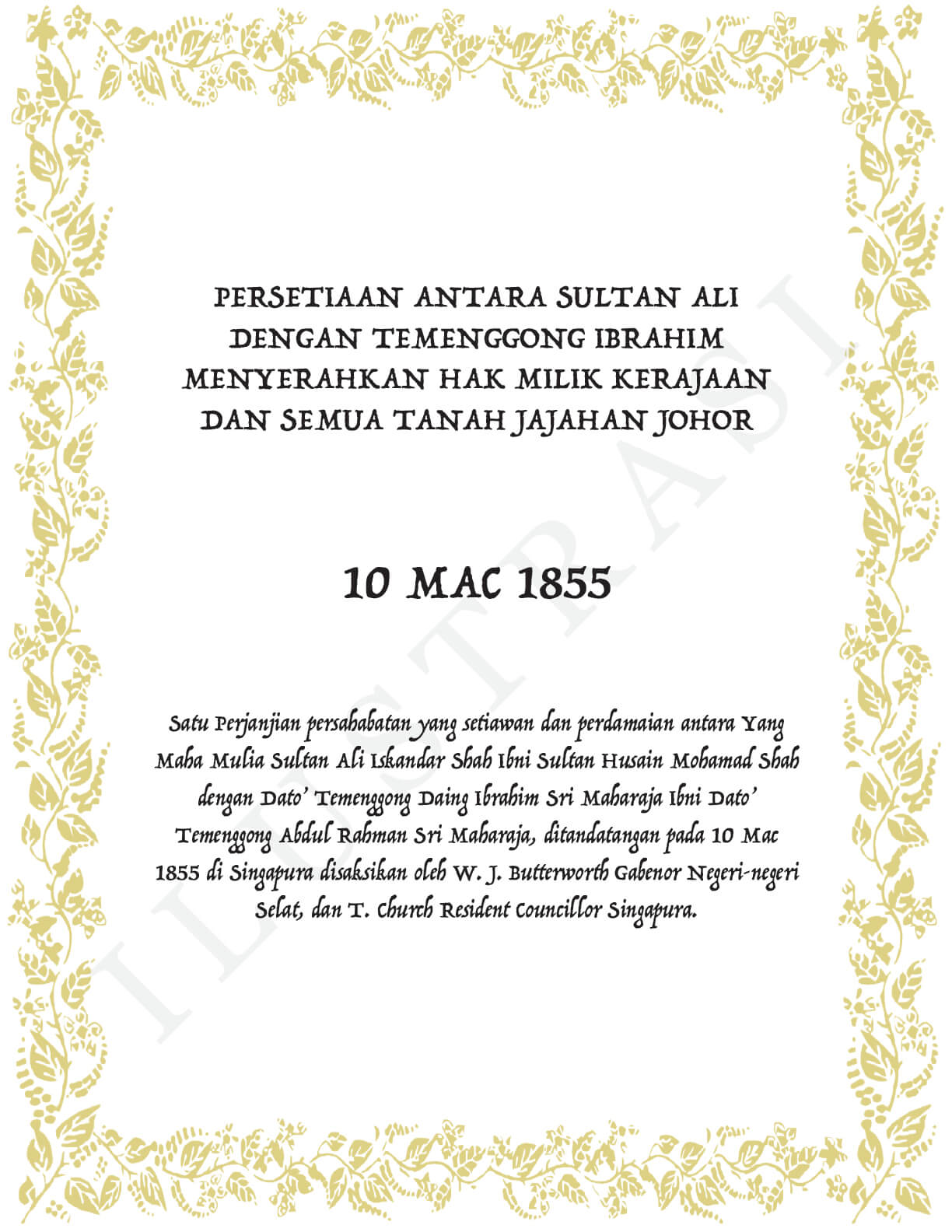 Satu perjanjian persahabatan yang setiakawan dan perdamaian antara Yang Maha Mulia Sultan Ali Iskandar Shah Ibni Sultan Husain Mohamad Shah dengan Dato’ Temenggong Daeng Ibrahim Sri Maharaja Ibni Dato’ Temenggong Abdul Rahman Sri Maharaja ditandatangani pada 10 Mac 1855 di Singapura dengan disaksikan oleh W. J. Butterworth, Gabenor Negeri-Negeri Selat dan T. Church, Resident Councillor Singapura.