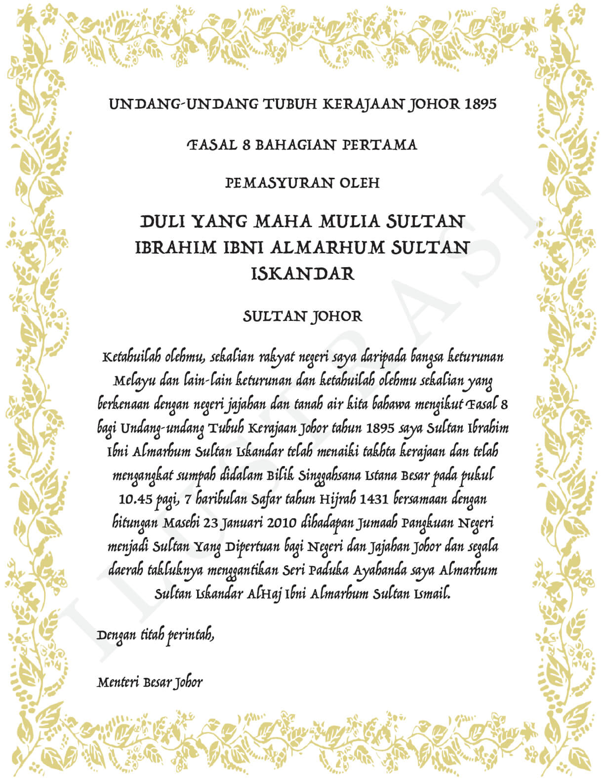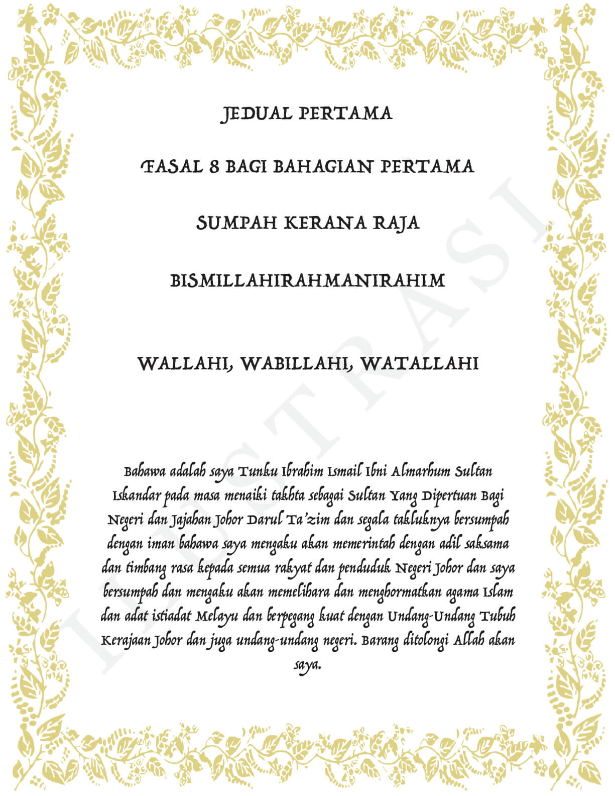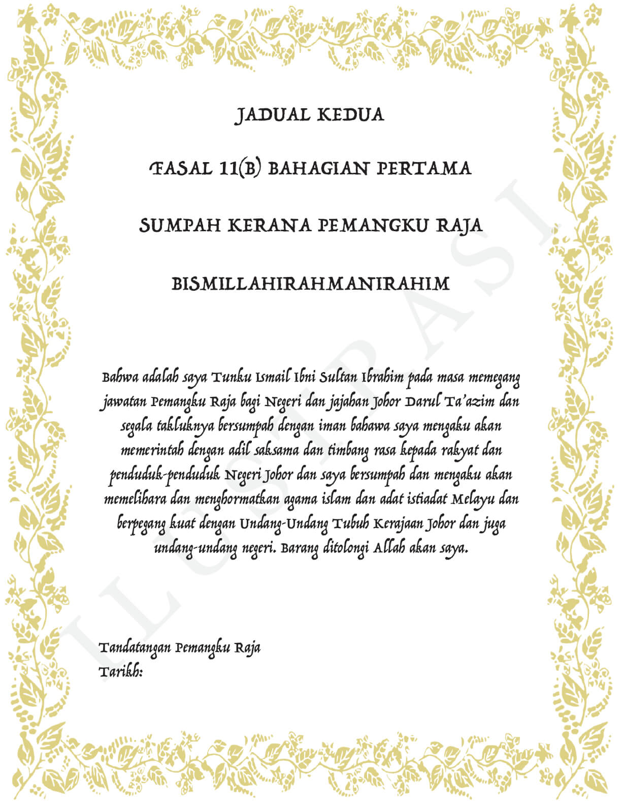 Fasal 9 (1)(i) memperuntukkan jika pada masa naik takhta Raja masih kecil dan belum cukup umur genap 21 tahun mengikut hitungan Hijriah, Jumaah Majlis DiRaja hendaklah melantik sebuah Jumaah Pangkuan Raja (Council of Regency) bagi menjalankan kerja-kerja Raja. Fasal 11D menetapkan Jumaah Pangkuan Raja mengandungi tiga ahli dari bangsa Melayu beragama Islam dan rakyat DYMM Tuanku, dengan syarat seorang yang menjadi Ahli Majlis Mesyuarat Kerajaan atau Ahli Dewan Undangan Negeri tidak boleh dilantik menjadi Ahli Jumaah Pangkuan Raja.